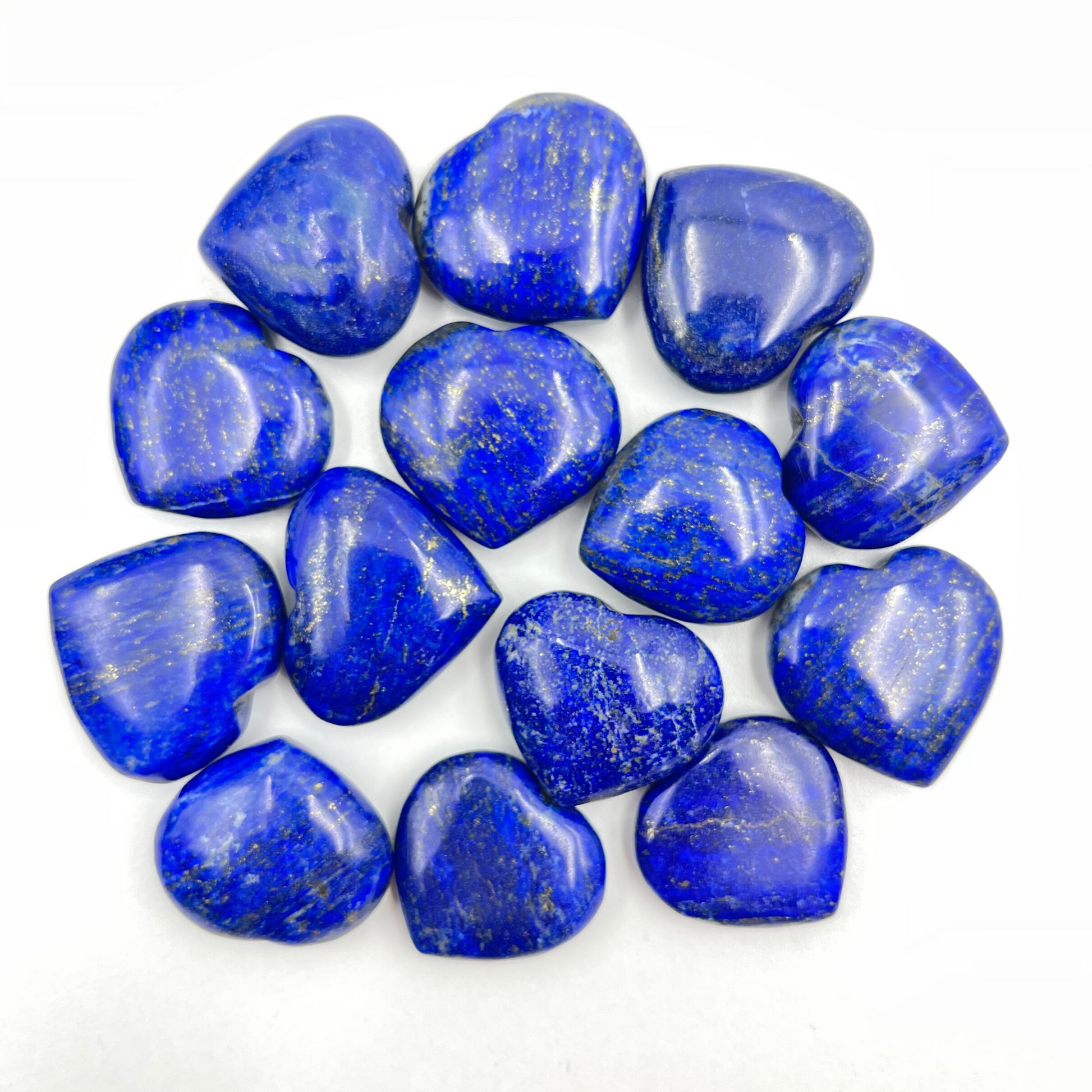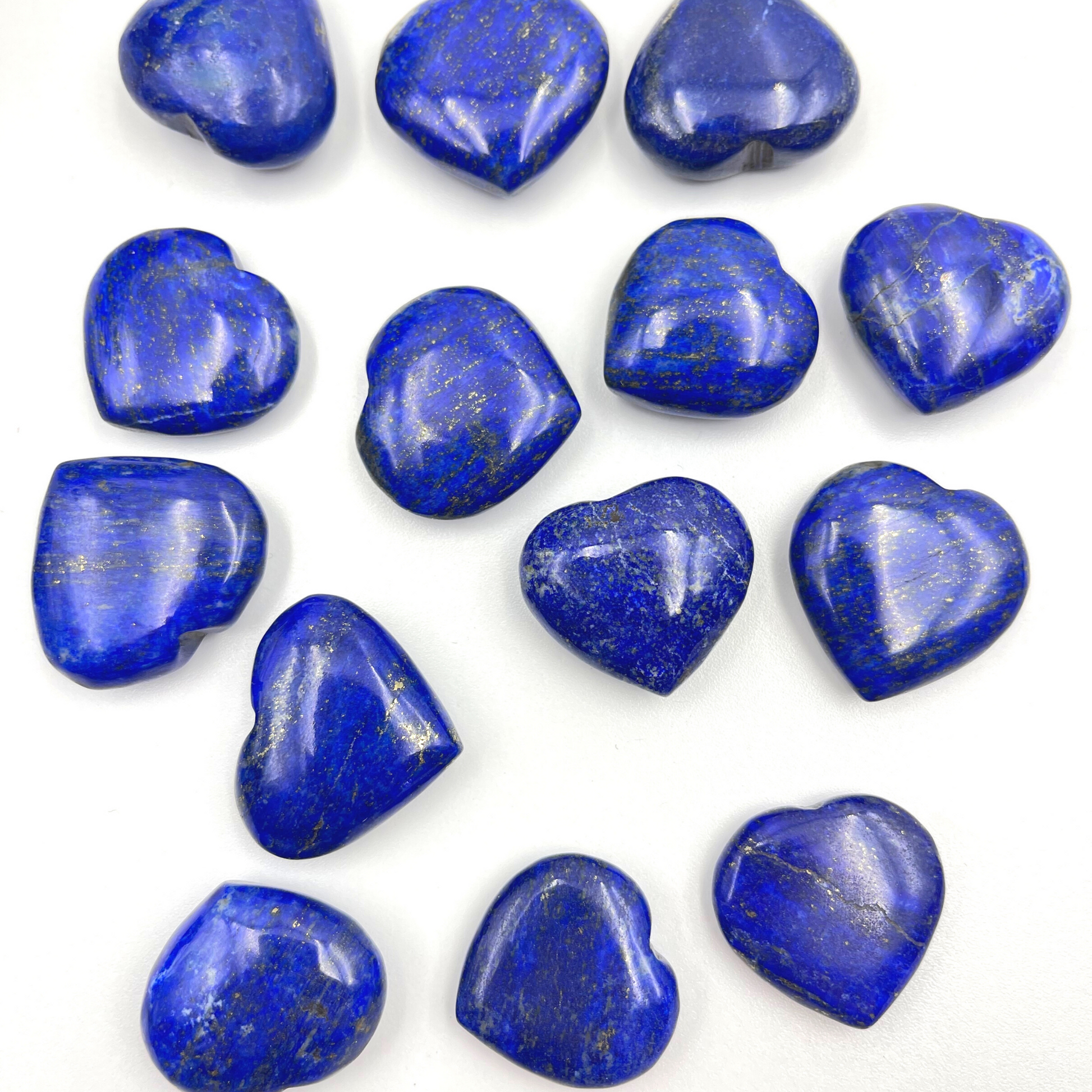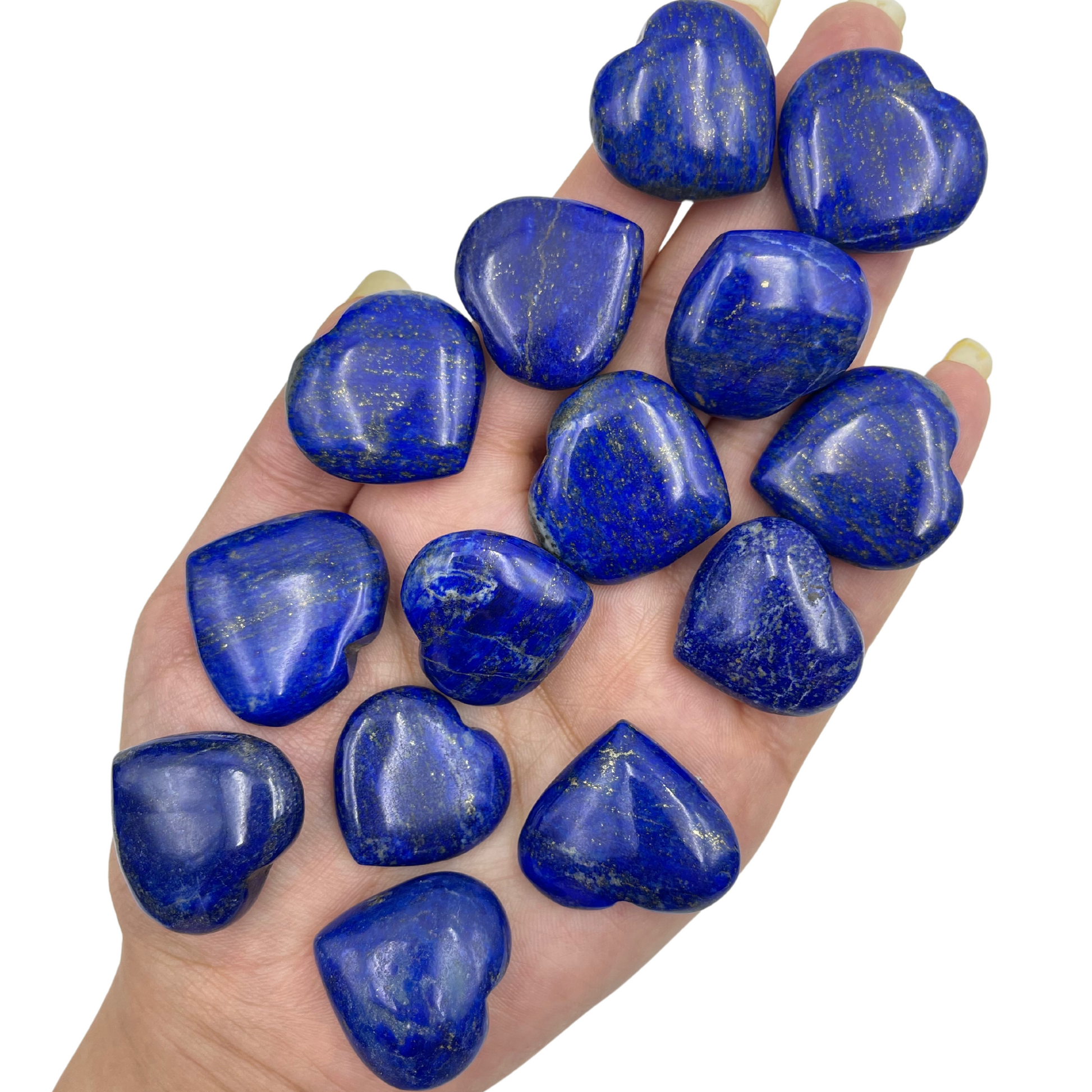 Lapis Lazuli Hearts from Afghanistan. High-grade loyal blue Lapis with natural polish. Lapis Lazuli has the mineral composition of Lazurite (blue), Calcite (white), and gold (pyrite). You will receive an intuitively chosen heart from the lot in the picture.